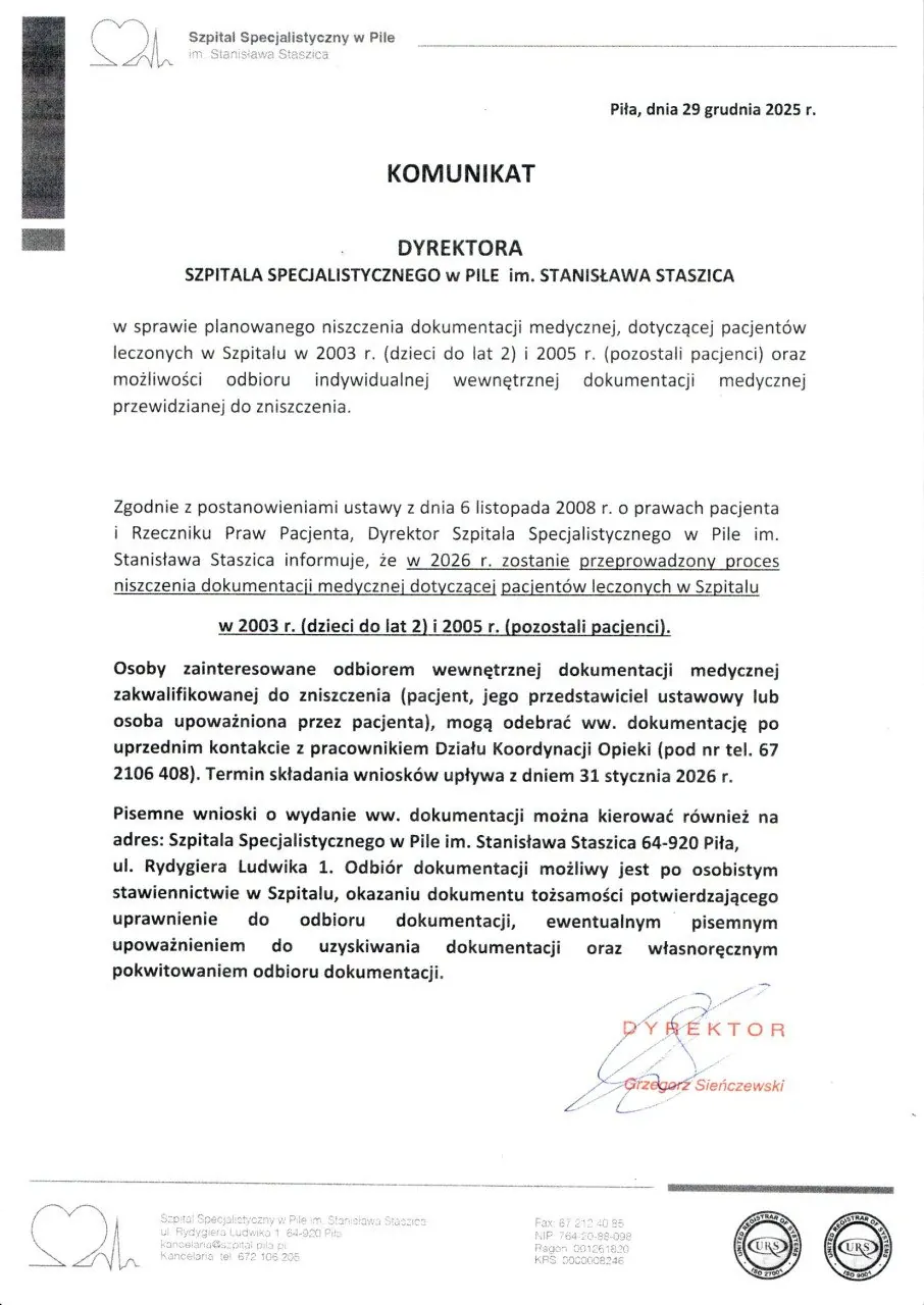 Informujemy, że poniedziałek - 10 listopada 2025 r. będzie w naszej placówce dniem wolnym od pracy. Tego dnia Szpital będzie funkcjonował jak w dni świąteczne,...