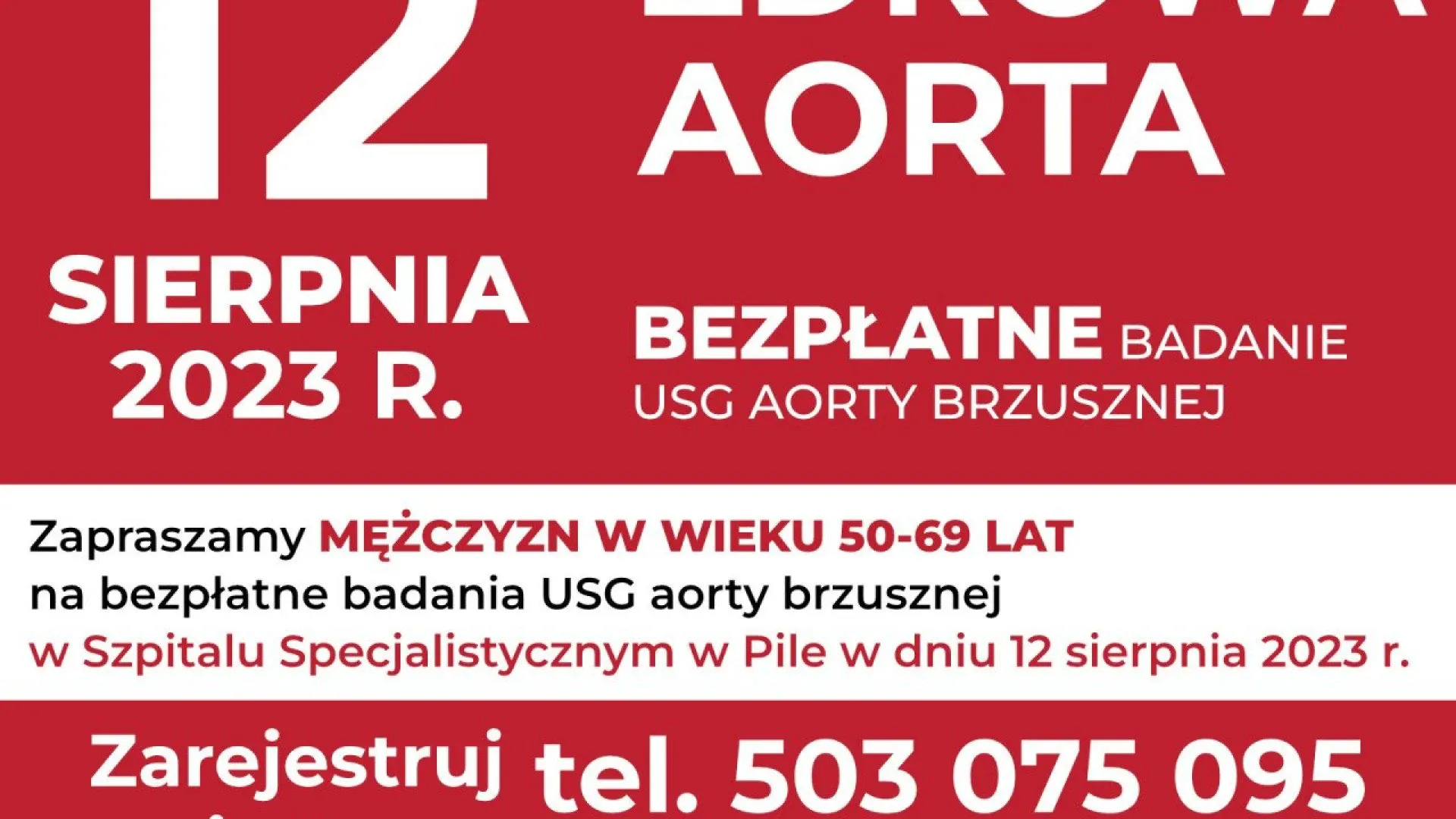 Serdecznie zapraszamy na bezpłatne badanie USG aorty brzusznej w Wielkopolskim Programie Zdrowotnym ZDROWA AORTA, które odbędzie się w dniu 12.08.2023 r. w Szpitalu Specjalistycznym w Pile ul. Rydygiera 1 (lokalizacja — Przyszpitalne Poradnie Specjalistyczne -I piętro)