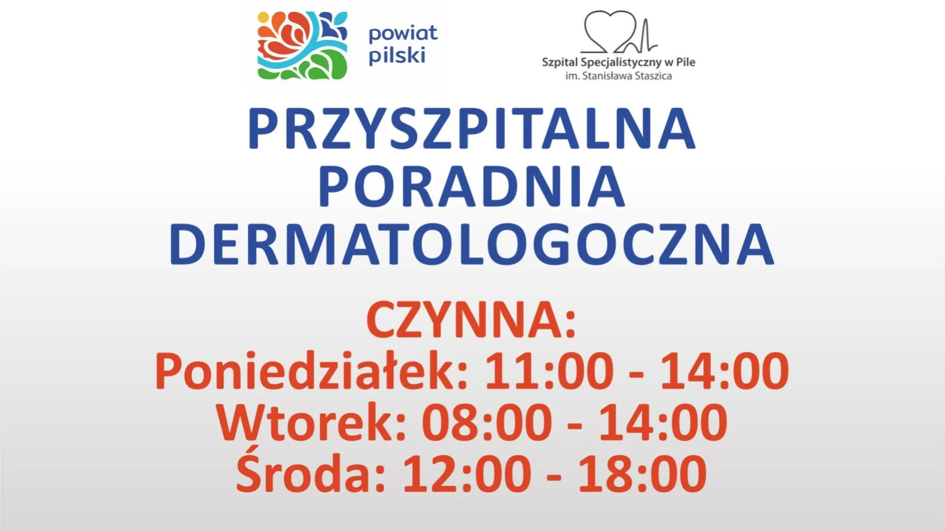 Przyszpitalna Poradnia Dermatologiczna będzie przyjmować pacjentów w poniedziałki od godz. 11 do 14, we wtorki od 8 do 14 i w środy od 12 do 18. Natomiast Przyszpitalna Poradnia Nefrologii i Chorób Wewnętrznych we wtorki i środy od godz. 13 do 15.