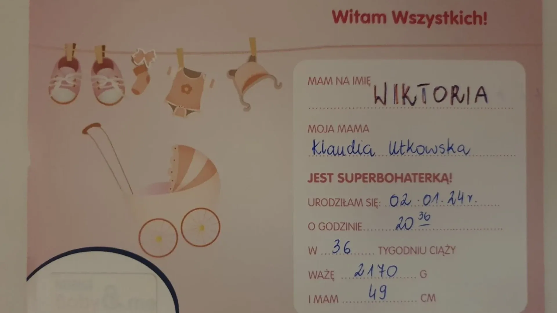 Wiktoria natomiast urodziła się o 20.36 i waży 2170 g i ma 49 cm. Jej rodzice Klaudia i Krzysztof z podziwem patrzą na córkę.
