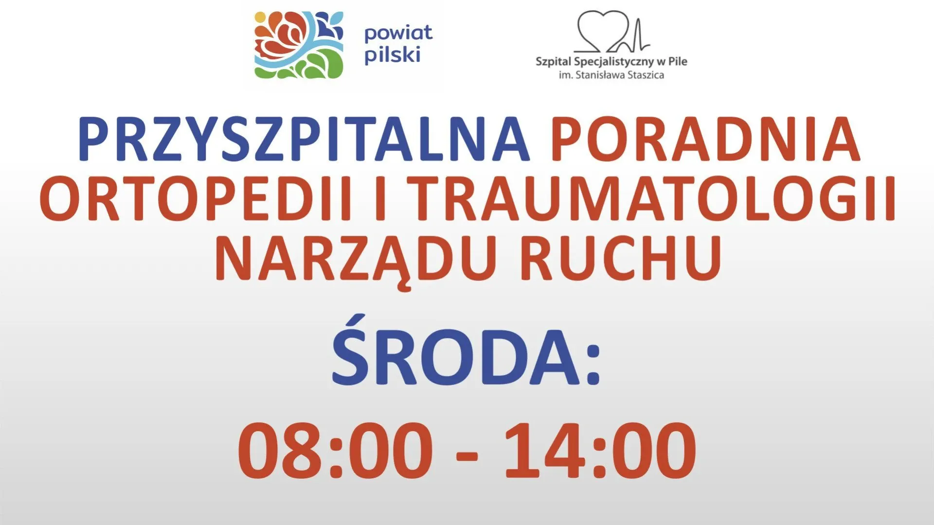 • Przyszpitalna Poradnia Ortopedii i Traumatologii Narządu Ruchu — w środy od godziny 8:00 do 14:00
