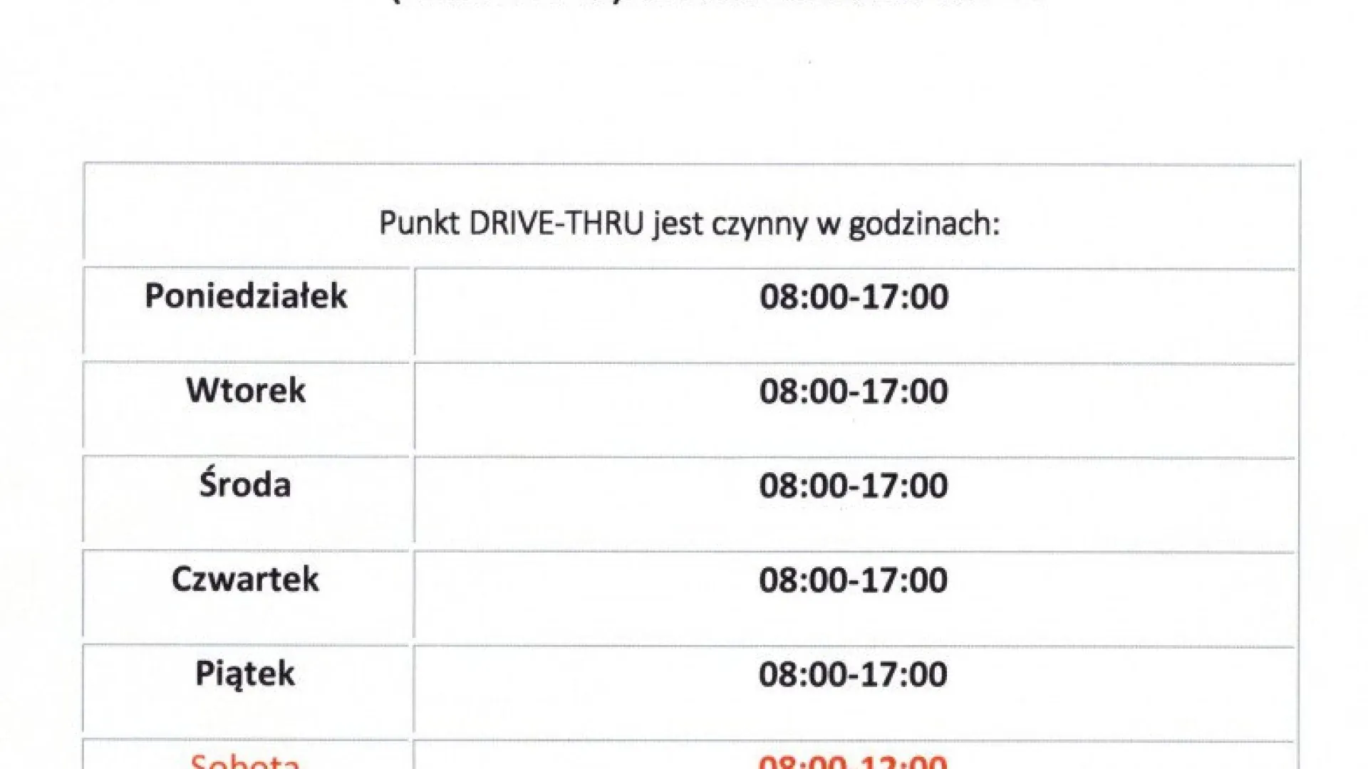 Pobranie wymazów odbywa się w Punkcie Pobrań Wymazów (DRIVE-THRU)