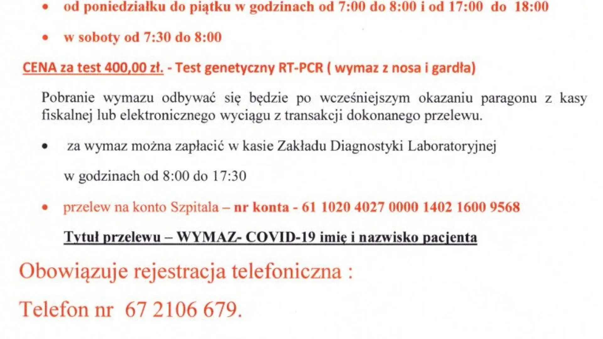 - przelew na konto Szpitala- nr konta - 611020 4027 0000 1402 16 00 956 8 Tytuł przelewu WYMAZ- COVID-19 imię i nazwisko pacjenta