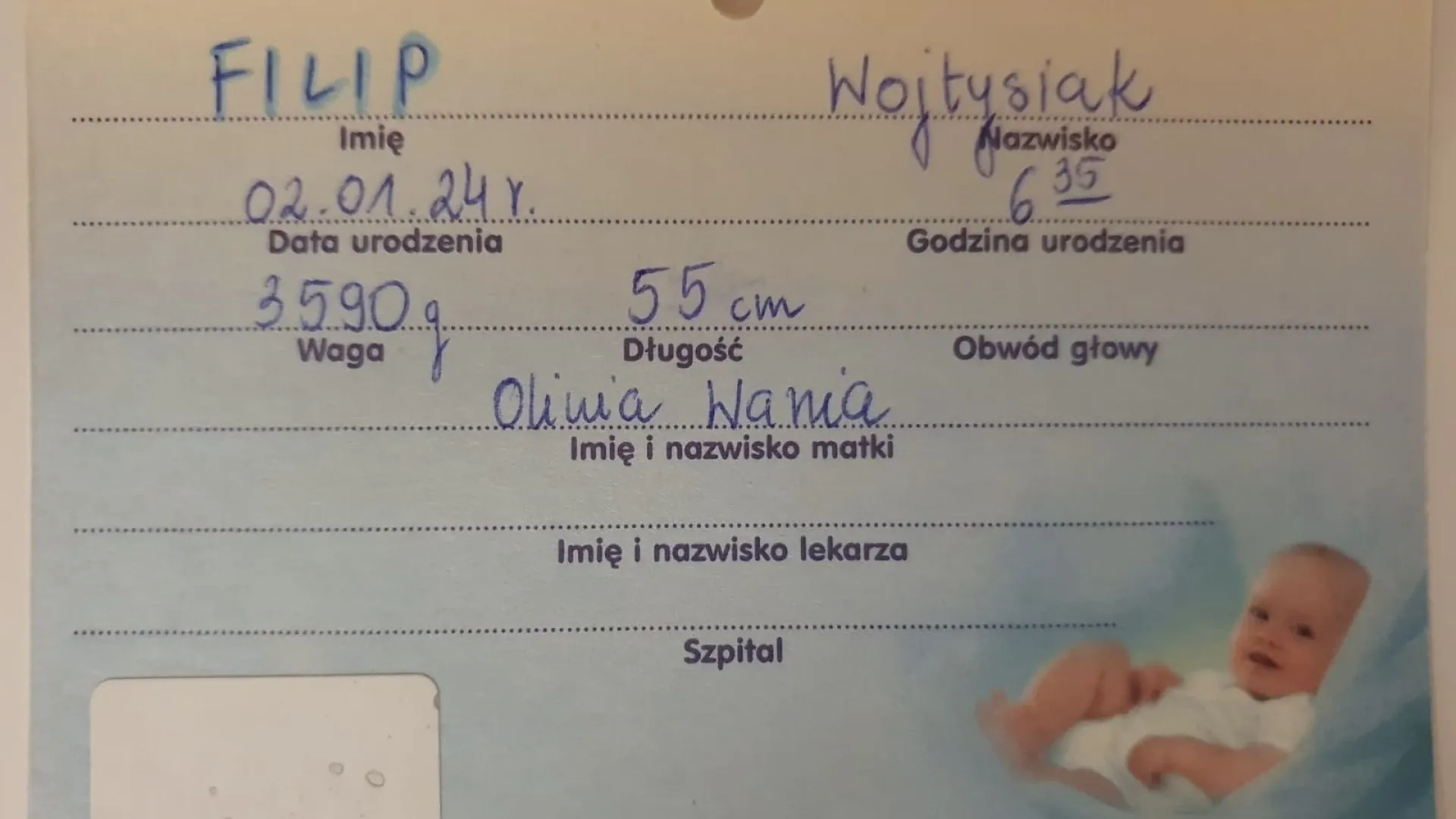 Pierwszym dzieckiem, które przyszło na świat w Szpitalu Specjalistycznym w Pile w 2024 roku, był Filip. Chłopiec urodził się 2 stycznia o godzinie 6.35 i waży 3590 g i ma 55 cm. Jego rodzice Oliwia i Damian są przeszczęśliwi.