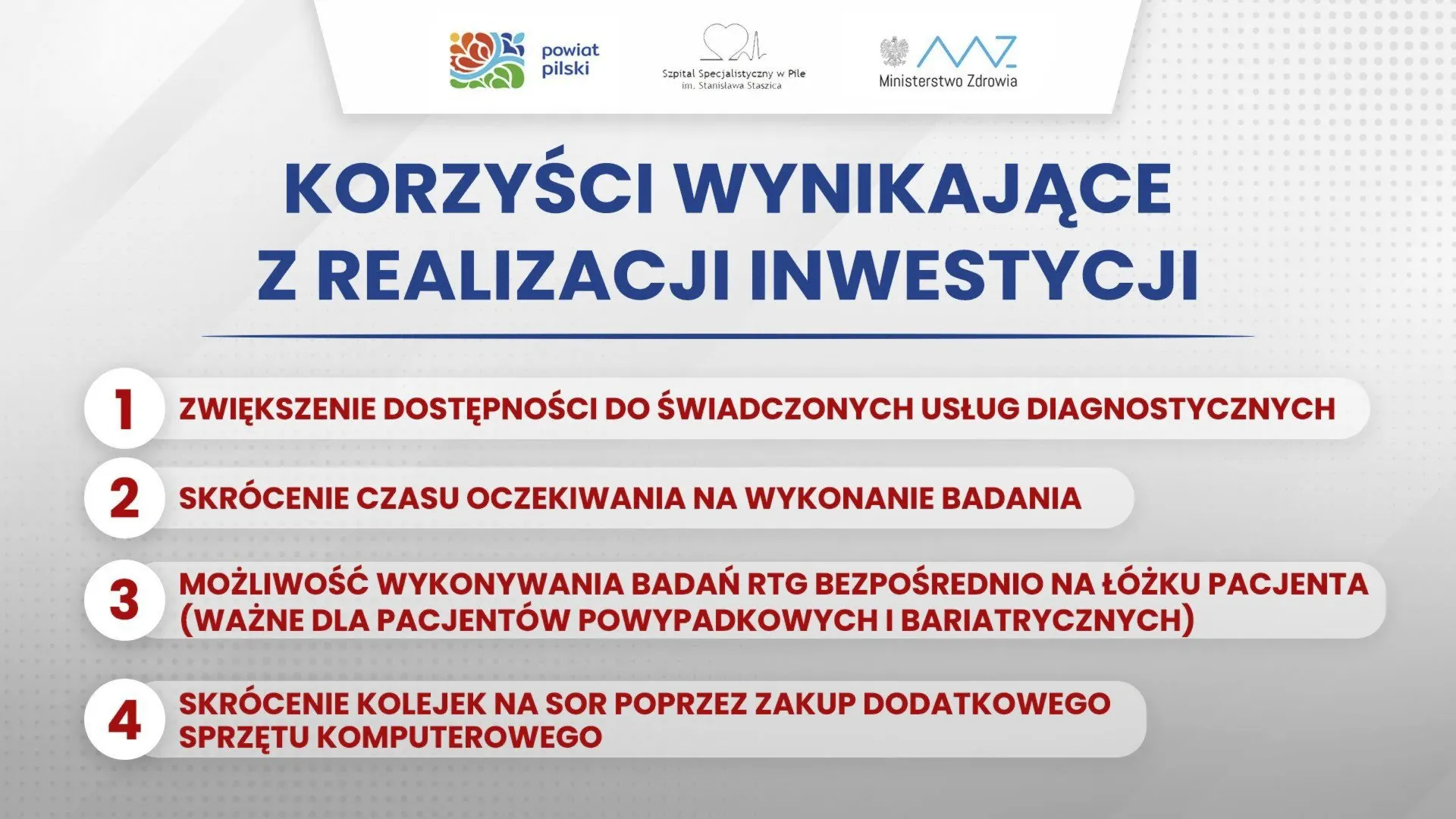 - Dzięki tym inwestycją znacząco zwiększy się dostępność do świadczonych usług diagnostycznych, skróci czas oczekiwania na wykonanie badania, a co najważniejsze poprawi komfort i jakość obsługi pacjentów. Dodatkowo poprzez zakup sprzętu komputerowego zmniejszą się również kolejki na SOR – podkreśla Wojciech Szafrański, dyrektor Szpitala Specjalistycznego im. Stanisława Staszica w Pile.