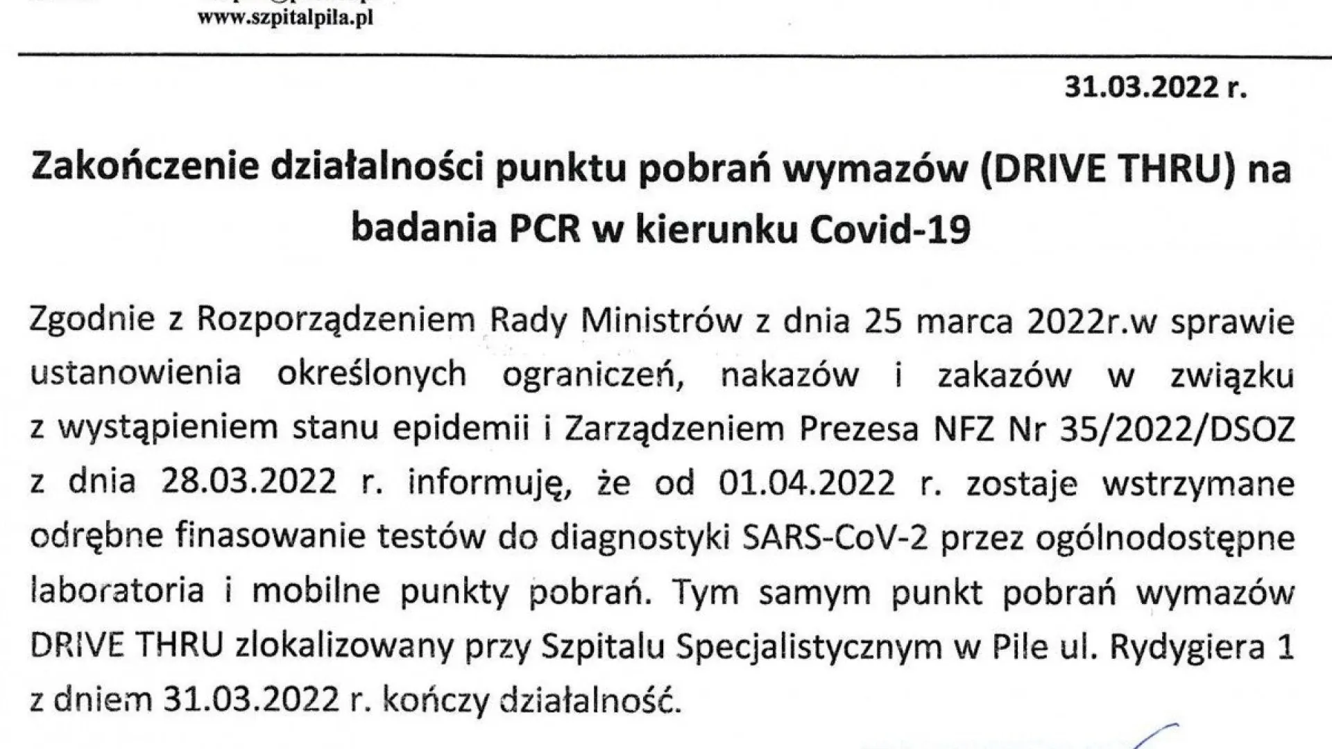 Zgodnie z Rozporządzeniem Rady Ministrów z dnia 25 marca 2022r.w sprawie ustanowienia określonych ograniczeń, nakazów i zakazów w związku z wystąpieniem stanu epidemii i Zarządzeniem Prezesa NFZ Nr 35/2022/DSOZ z dnia 28.03.2022 r. informuję, że od 01.04.2022 r. zostaje wstrzymane odrębne finasowanie testów do diagnostyki SARS-CoV-2 przez ogólnodostępne laboratoria i mobilne punkty pobrań. Tym samym punkt pobrań wymazów DRIVE THRU zlokalizowany przy Szpitalu Specjalistycznym w Pile ul. Rydygiera 1 z dniem 31.03.2022 r. kończy działalność.