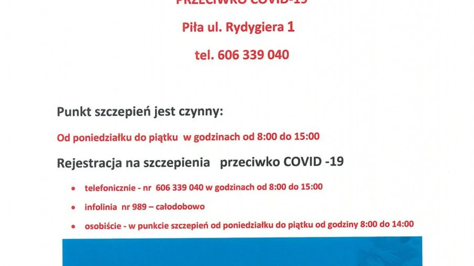 - osobiście - w punkcie szczepień od poniedziałku do piątku od godziny 8:00 do 14:00