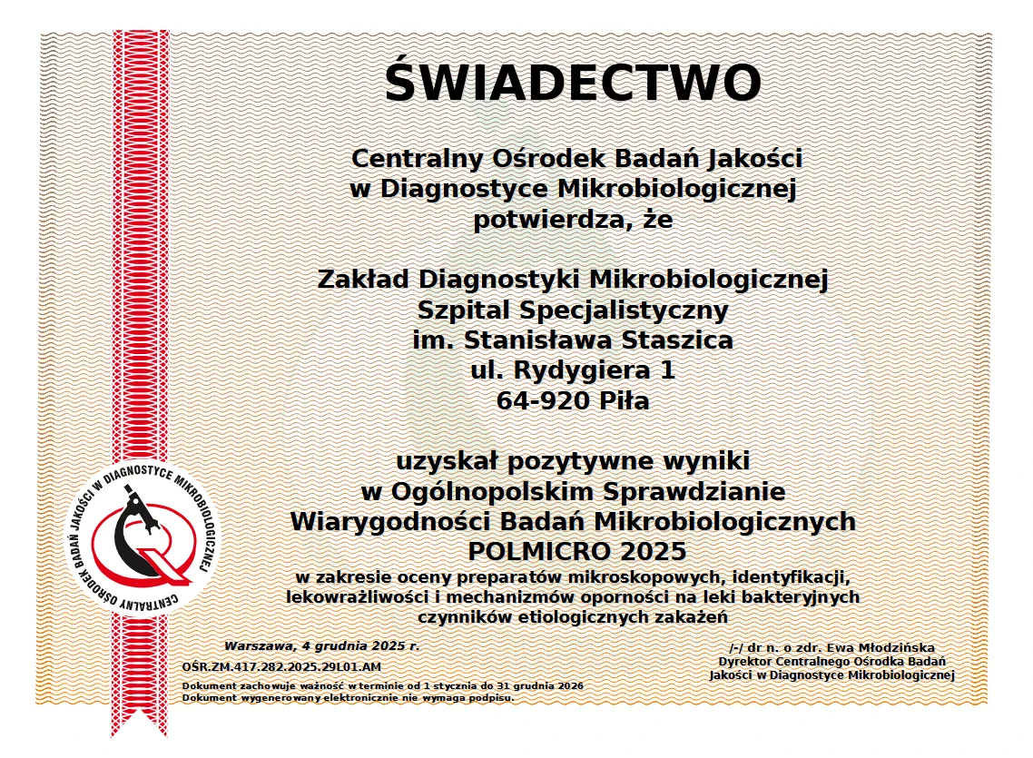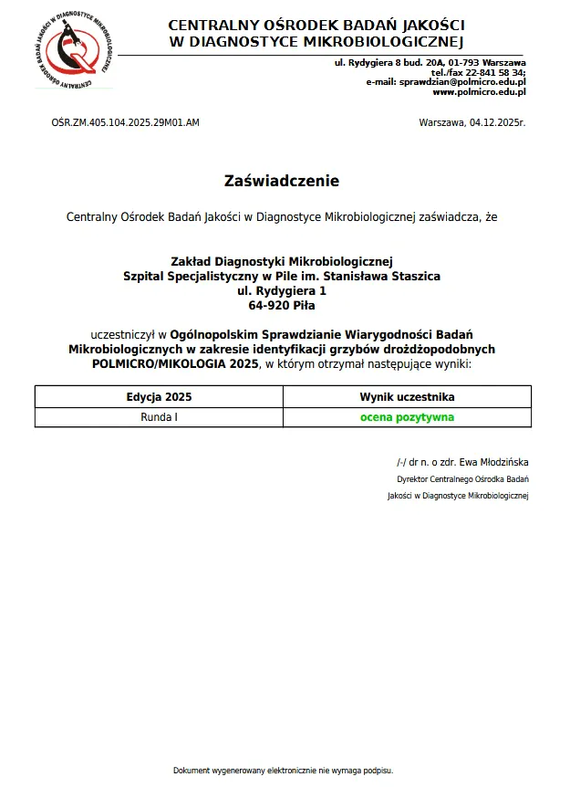 Zaświadczenie Instytutu Hematologii i Transfuzjologii: 27 styczeń 2025r. Pracownia Immunologii Transfuzjologicznej uczestniczyła w Krajowym programie Zewnętrznej Oceny Jakości dla Laboratoriów Immunologii Transfuzjologicznej.