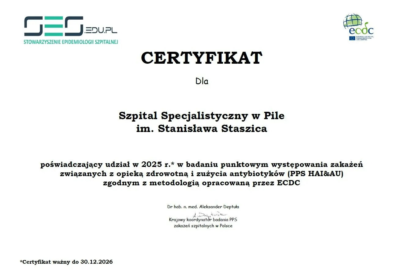 Zaświadczenie Instytutu Hematologii i Transfuzjologii: 27 styczeń 2025r. Pracownia Immunologii Transfuzjologicznej uczestniczyła w Krajowym programie Zewnętrznej Oceny Jakości dla Laboratoriów Immunologii Transfuzjologicznej.